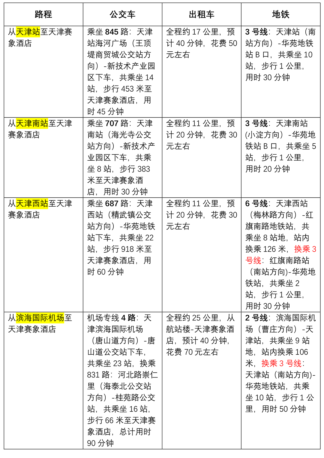 1.公交車:乘坐 707 路:天津南站(海光寺公交 站方向)-新技術產 業園區下車,共乘 坐 8 站,步行 383 米至天津賽象酒 店,用時 30 分鐘