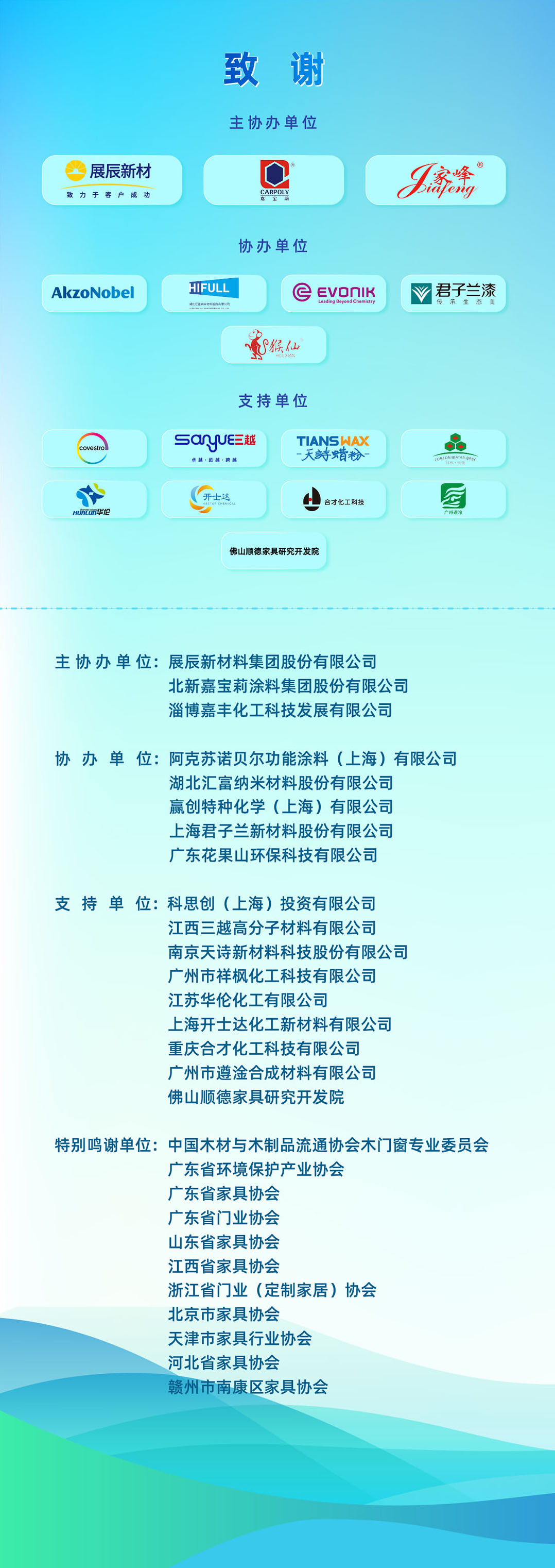 特別感謝本次主協辦單位展辰新材料集團股份有限公司、北新嘉寶莉涂料集團股份有限公司、淄博嘉豐化工科技發展有限公司;協辦單位阿克蘇諾貝爾功能涂料(上海)有限公司、湖北匯富納米材料股份有限公司、贏創特種化學(上海)有限公司、上海君子蘭新材料股份有限公司、廣東花果山環保科技有限公司;支持單位科思創(上海)投資有限公司、江西三越高分子材料有限公司、南京天詩新材料科技股份有限公司、廣州市祥楓化工科技有限公司、江蘇華倫化工有限公司、上海開士達化工新材料有限公司、重慶合才化工科技有限公司、廣州市遵淦合成材料有限公司、佛山順德家具研究開發院,特別鳴謝單位中國木材與木制品流通協會、木門窗專業委員會廣東省環境保護產業協會、廣東省家具協會、廣東省門業協會、山東省家具協會、江西省家具協會、浙江省門業(定制家居)協會、北京市家具協會、天津市家具行業協會、河北省家具協會、贛州市南康區家具協會對本此大會的大力支持。