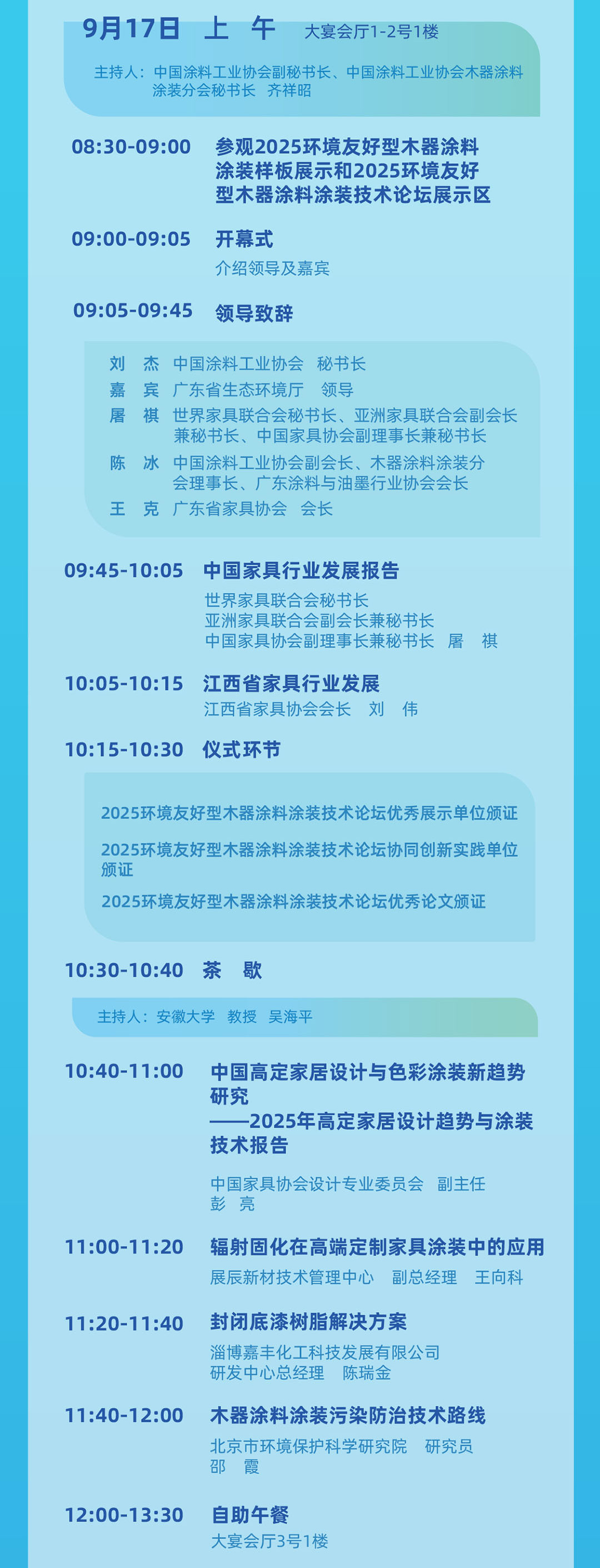 17日上午9時許,2025環境友好型木器涂料涂裝技術論壇暨中國涂料工業協會木器涂料涂裝分會年會開幕式舉行。中國涂料工業協會秘書長劉杰,廣東省生態環境廳大氣處副處長許技科,世界家具聯合會秘書長、亞洲家具聯合會副會長兼秘書長、中國家具協會副理事長兼秘書長屠祺,中國涂料工業協會副會長兼中國涂料工業協會木器涂料涂裝分會理事長陳冰,中國林產工業協會副秘書長黃安民,廣東省家具協會會長王克,廣東省門業協會執行會長徐生,江西省家具協會會長劉偉,山東省家具協會副會長韓慶生,浙江省門業協會秘書長李進,廣東省環境科學研究院廖程浩,北京市生態環境保護科學研究院研究員邵霞,廣東省涂料與油墨行業協會名譽會長黃開,安徽大學教授吳海平,北京化工大學教授何立凡,華南理工大學教授涂偉萍,江西省涂料行業協會會長謝志明,中國家具協會設計專業委員會副主任彭亮,順德家具協會秘書長黃梓麒,大自然家居研究院院長楊亮慶,百得勝家居副總經理楊森杰,佛山順德家具研究開發院院長張建新,中國涂料工業協會木器涂料涂裝分會副秘書長朱延安、顧天兵以及來自展辰新材、北新嘉寶莉、君子蘭、阿克蘇諾貝爾、淄博嘉豐、廣東花果山、贏創、湖北匯富等領軍企業技術負責人,相關高校、科研院所專家,涂料上下游產業鏈的相關企業代表等應邀出席了本次會議。論壇由中國涂料工業協會副秘書長、中國涂料工業協會木器涂料涂裝分會秘書長齊祥昭,安徽大學教授吳海平,北京化工大學教授何立凡,中國涂料工業協會技術專家工作委員會常委、北新嘉寶莉涂料集團股份有限公司水性漆直銷部總經理朱延安先后主持。
